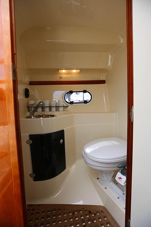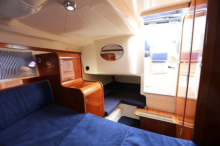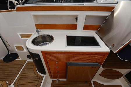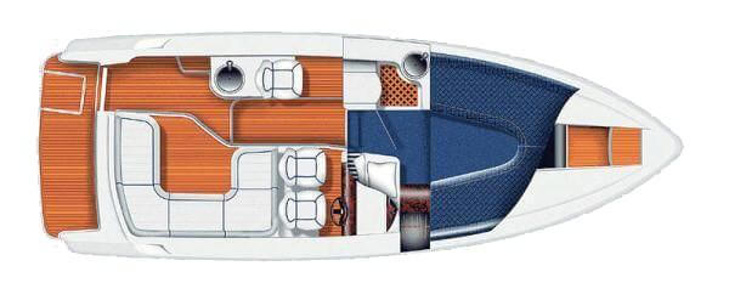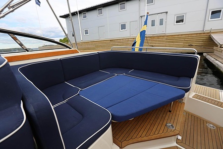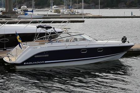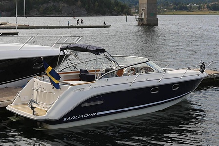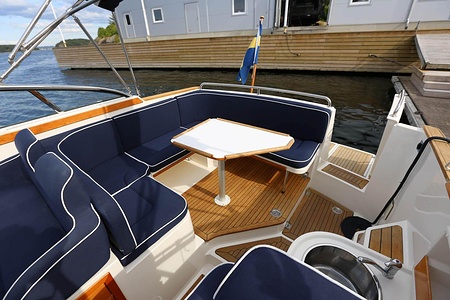 Aquador 26 DC har genomgående planlösning med väl tilltagna ytor . Aktersoffan, som också kan användas som dubbelkoj eller härlig solbädd varma sommardagar, blir båtens medelpunkt. Här sitter man bekvämt runt bordet och väntar på det som tillagas i pentryt mittemot med keramisk häll, kylskåp och diskho. Det är lätt att ta sig ut på den generösa badplattformen, genom dörren i akterspegeln.