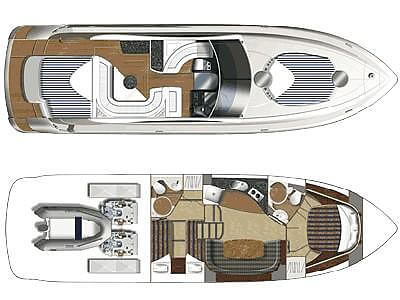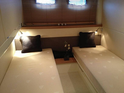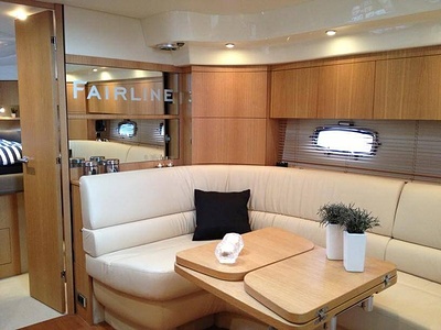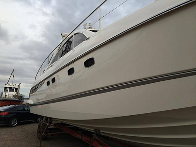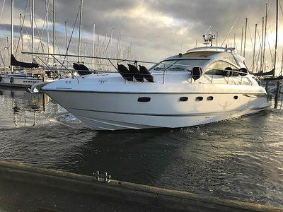 En välutrustad Fairline Targa 47 GT med vitt skrov tillverkad 2008, uttagen först 2009, utrustad med det större motoralternativet 2x Volvo Penta D9-575 hk som servats årligen.