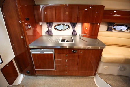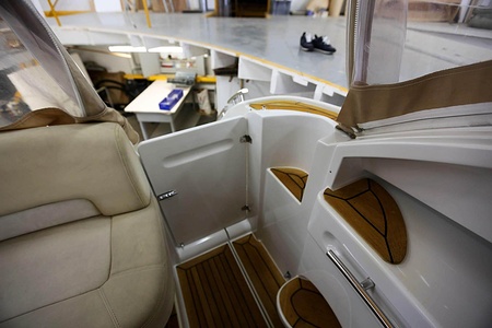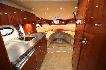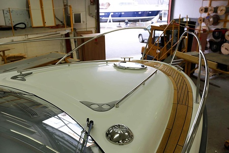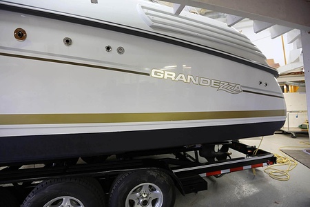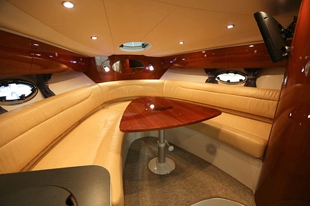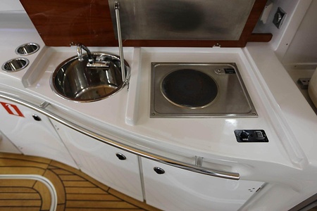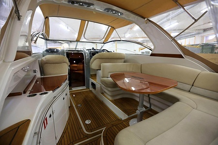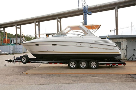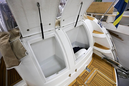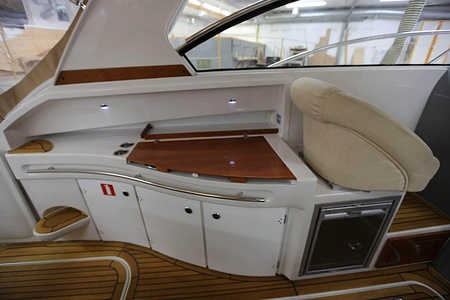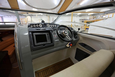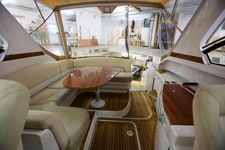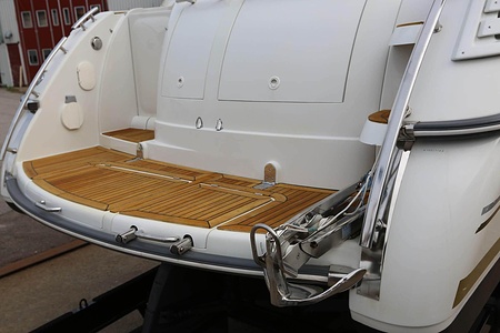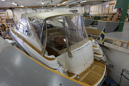 Finsktillverkad sportscruiser Grandezza 31 DC med targabåge och kapell. Pentry ute i sittbrunn och inne i sittbrunn. Två dubbelkabiner och bäddbart i sittbrunn ger 6 sovplatser.