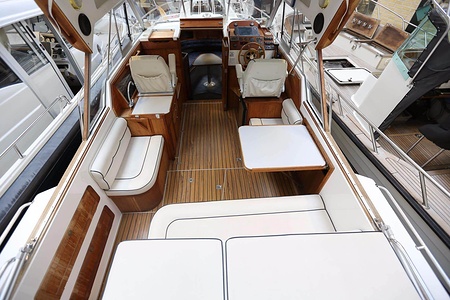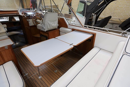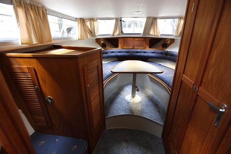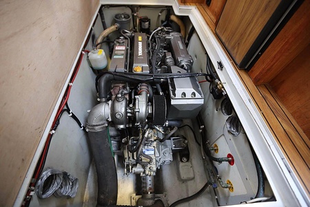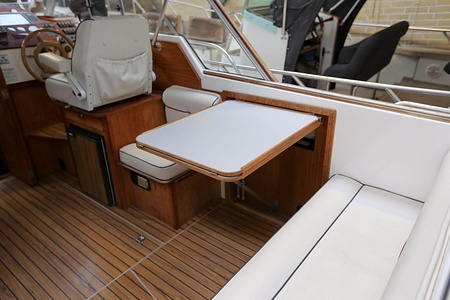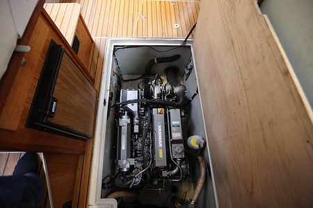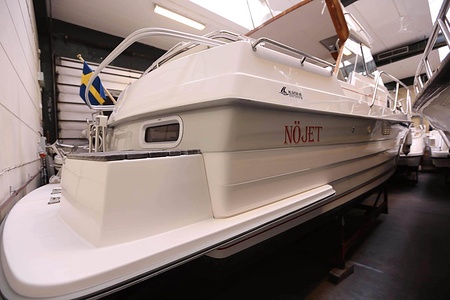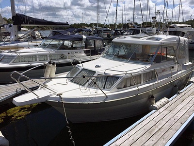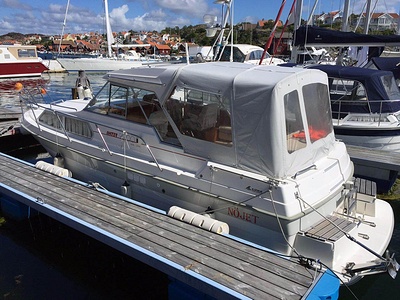 Norsktillverkad kabinbåt med pentry i sittbrunn, bäddbar salong nere, midkabin, WC och akterkabin. En Yanmar marindiesel med rak axel.
