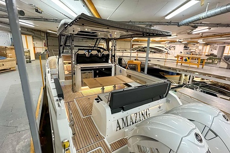 Båden kan beses på vores anlæg på Vindön, Sverige
