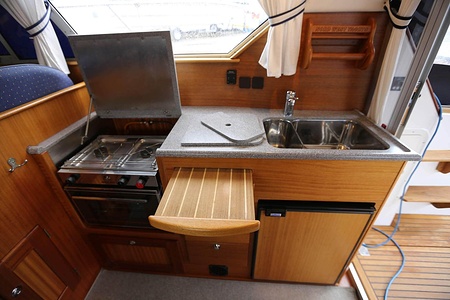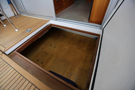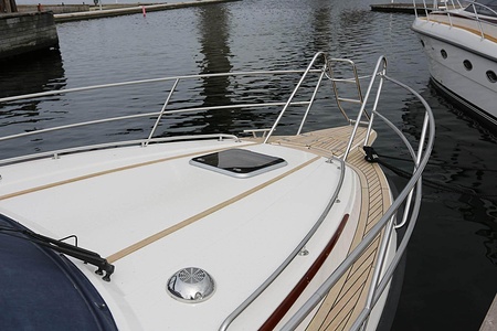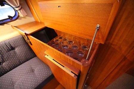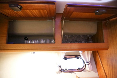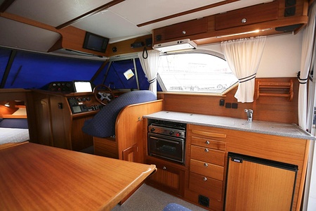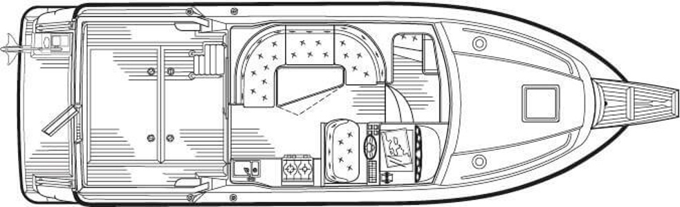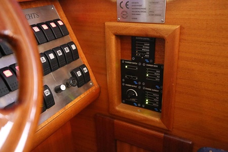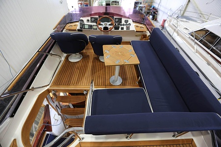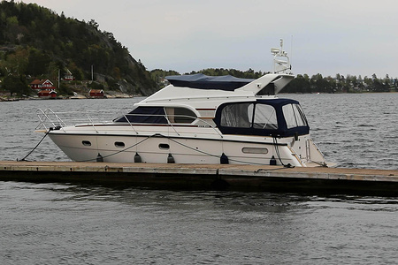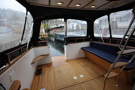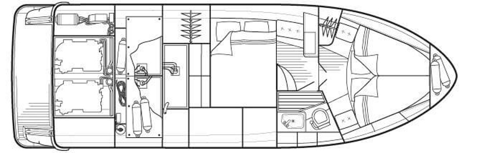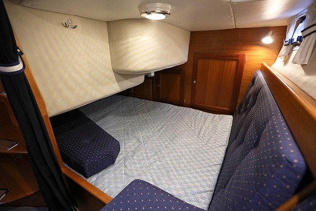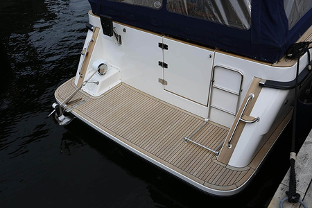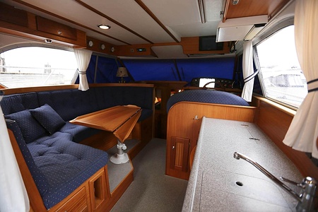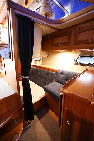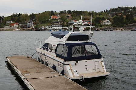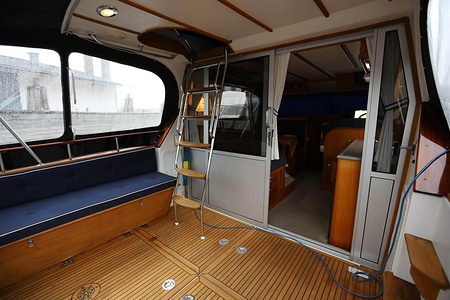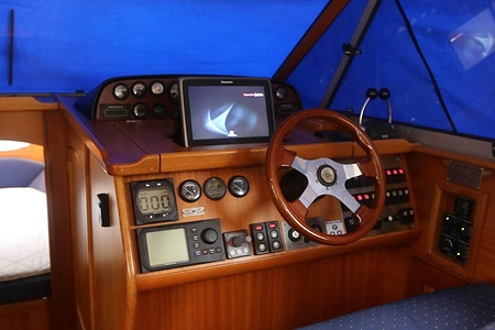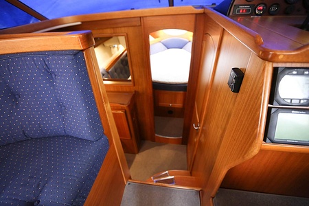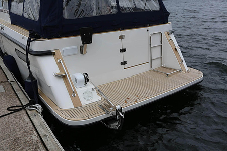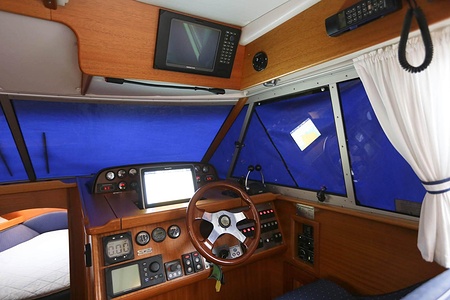 This NordWest 355 has a layout with six berths in two double cabins and lowerable table in saloon. There is very good storage possibilities and a large cockpit. The flybridge has a L-sofa and table (like a Nord West 390) and a radar arch of fiberglas (most NW355 has radar arch in white painted aluminium).