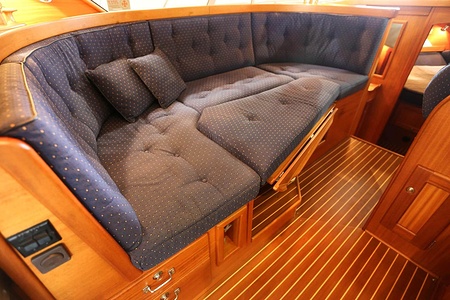 Sittbänk i teak i cockpit med blå dyna