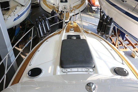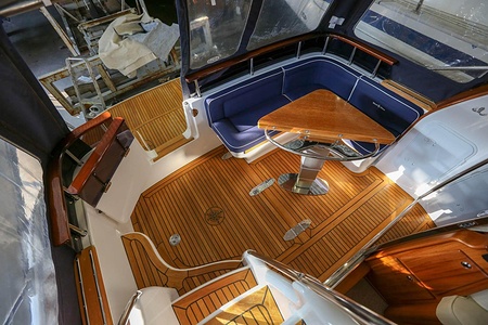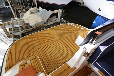 Komplett teakdäck; sittbrunn och fly-trappa, peke, fördäck, skarndäck, badplattform och flybridge