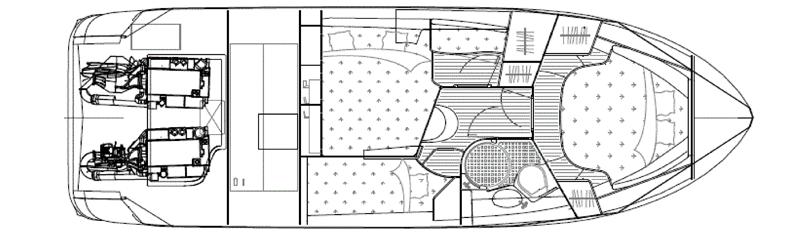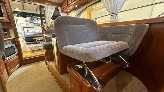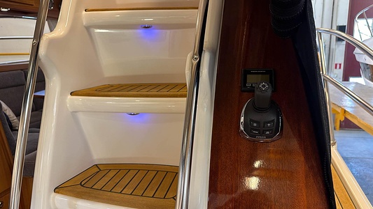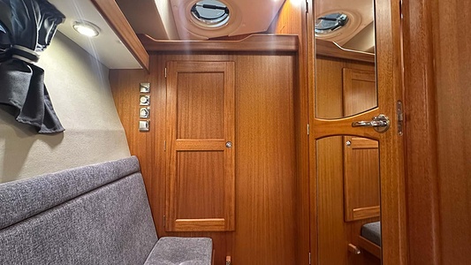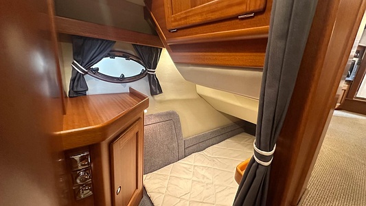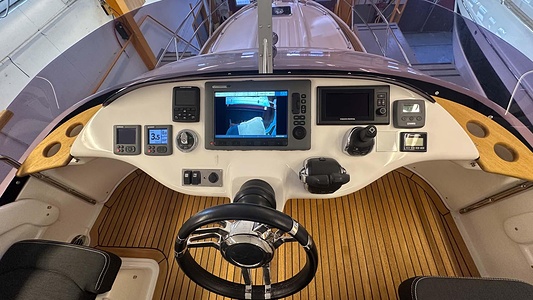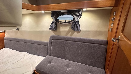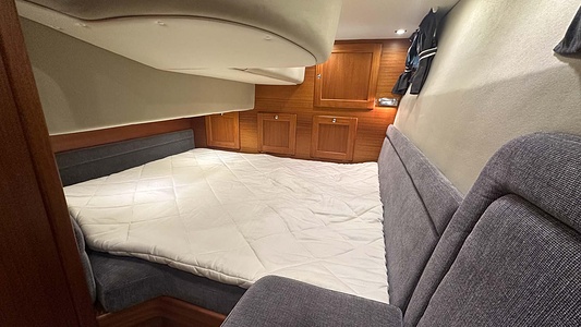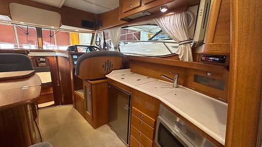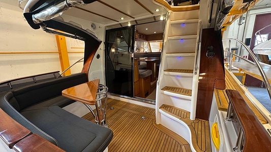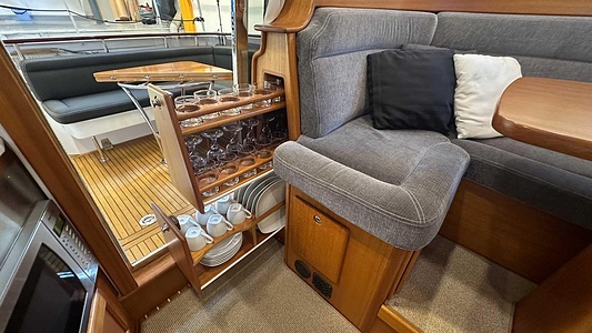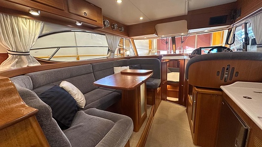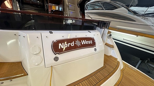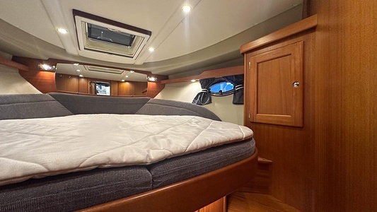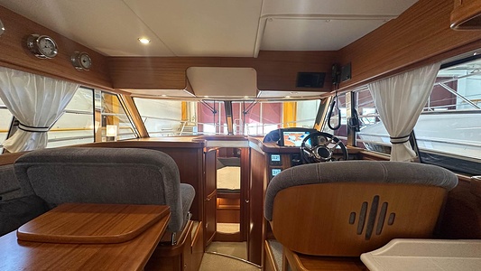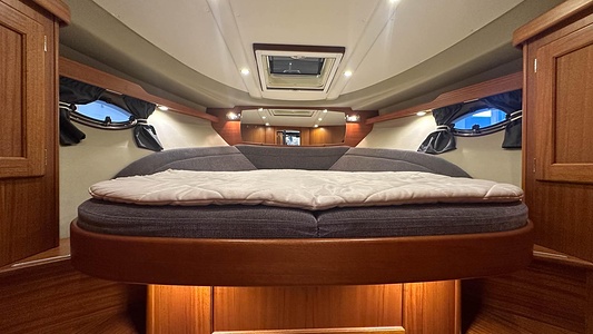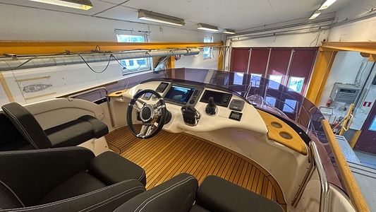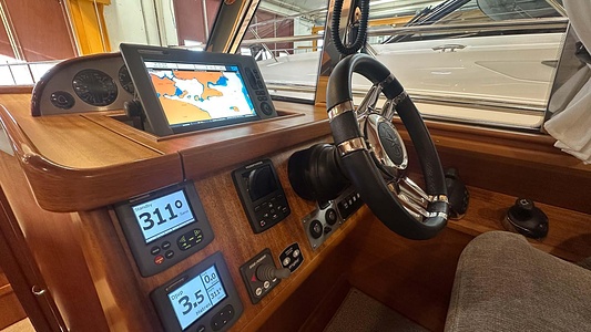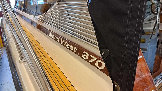 NordWest 370 Flybridge med den nya större sittbrunnen utrustad med DPS, Dynamic Positioning System. Detta ger dig fördelen att lägga till med hjälp av en joystick och genom att trycka på en knapp fixeras båten med hjälp av GPS-signaler. Layouten har tre kabiner, fem kojplatser och WC. Vändbar passagerarsoffa på babordssidan i salongen. Pentry på styrbordssidan av salongen.