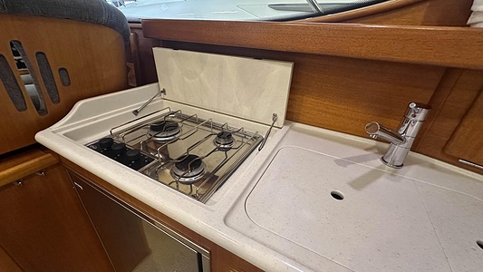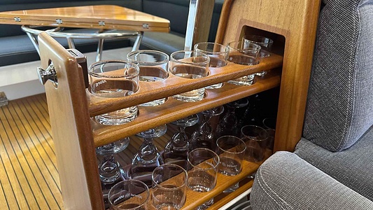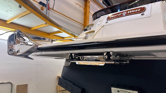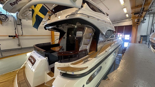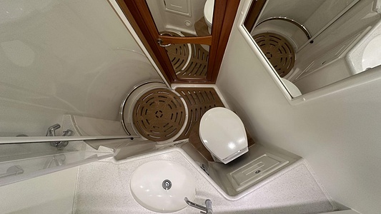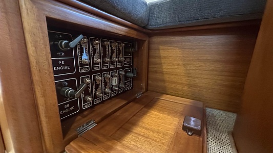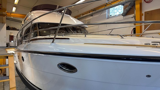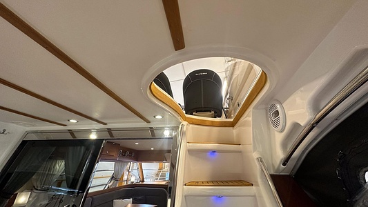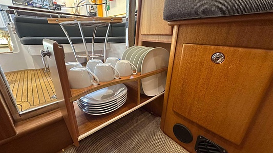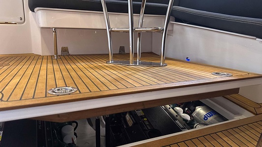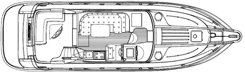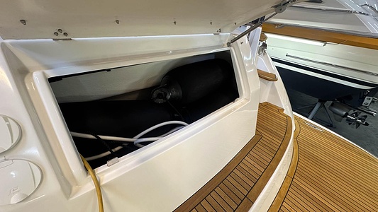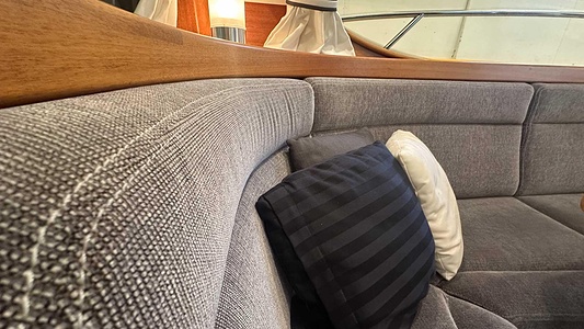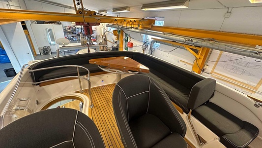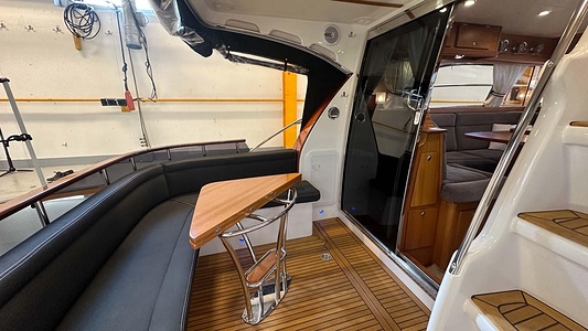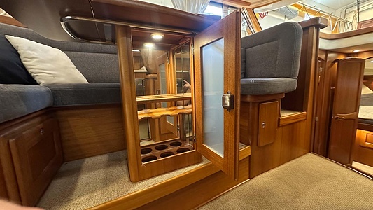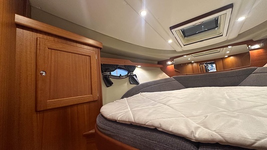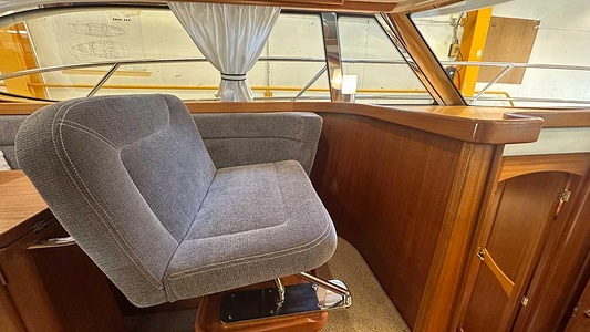 NordWest 370 Flybridge med den nya större sittbrunnen utrustad med DPS, Dynamic Positioning System. Detta ger dig fördelen att lägga till med hjälp av en joystick och genom att trycka på en knapp fixeras båten med hjälp av GPS-signaler. Layouten har tre kabiner, fem kojplatser och WC. Vändbar passagerarsoffa på babordssidan i salongen. Pentry på styrbordssidan av salongen.