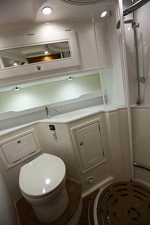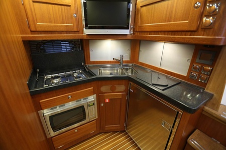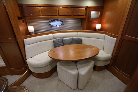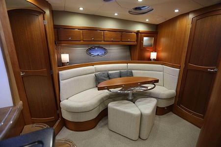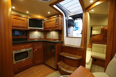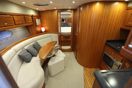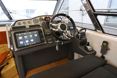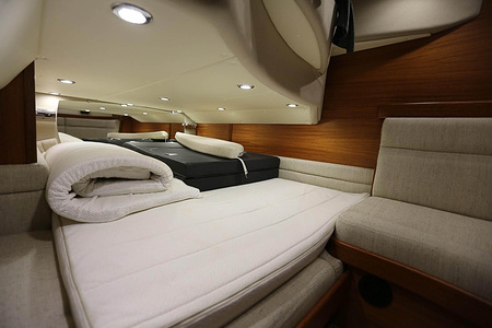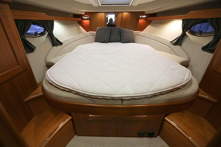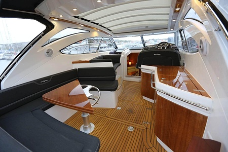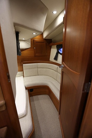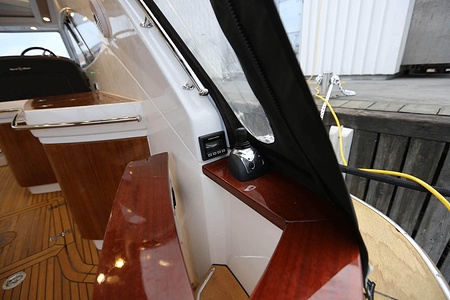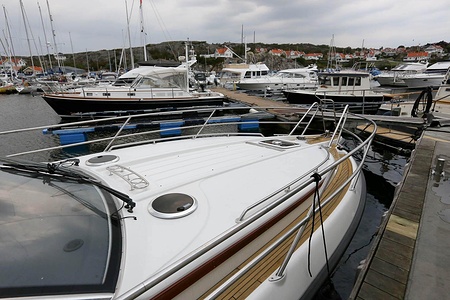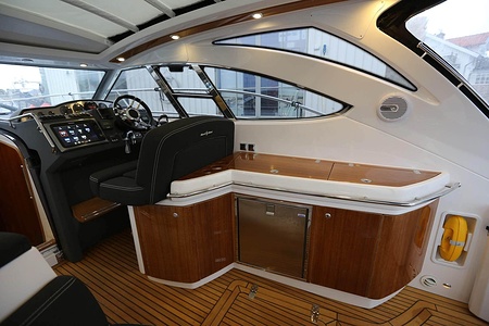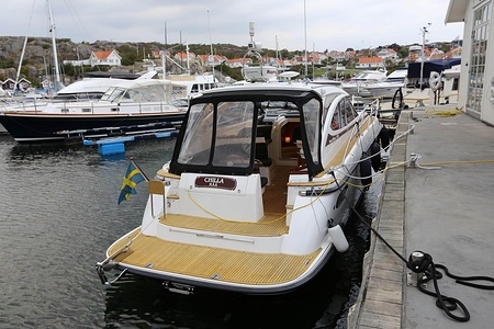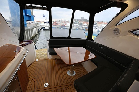 NordWest 370 sportscruiser med elektrisk kapelltak utrustad med joystick/drev. Två dubbelkabiner och bäddbart både i salong och sittbrunn.
