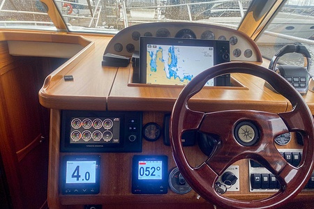 Välutrustad och rymlig yacht i fint skick. Uppdaterad med 2x Volvo Penta IPS 600 (435 hk, 2019) samt nytt Raymarine Axiom navigationssystem med autopilot och radar (2025). Joystick-styrning på både förarplats och flybridge.