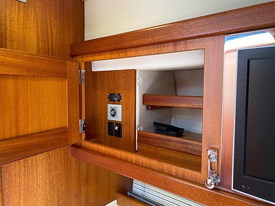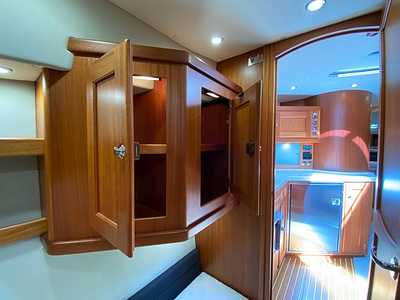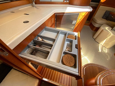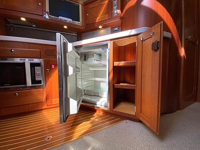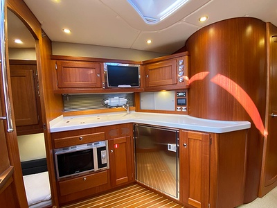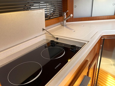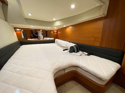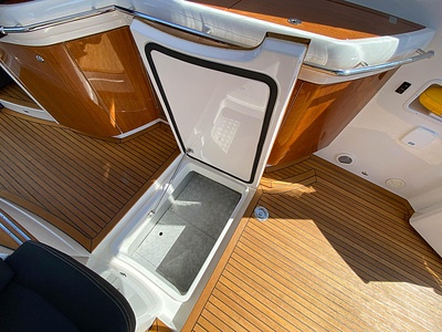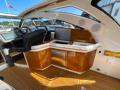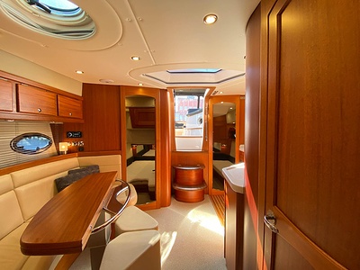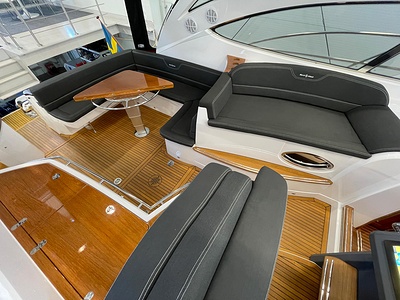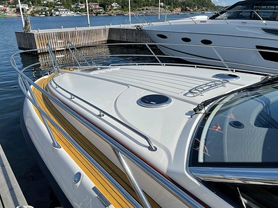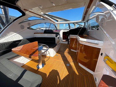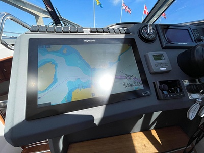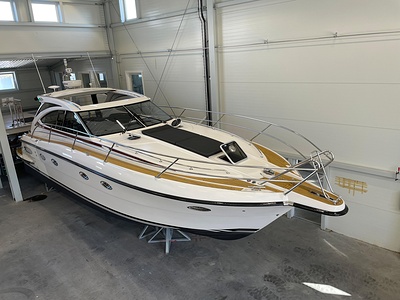 NordWest 430 Sportstop är en daycruiser med fantastiska sjöegenskaper, joystick för trygg tilläggning och bekvämt elektrisk kapelltak. Båten är dessutom utrustad med de största drevmotorerna med 400hk, Humphree automatiskt trimplanssystem, generator och vagga med vinsch för att kunna ta med sig en gummibåt eller vattenskoter. Tre dubbelkabiner och WC med duschkabin.