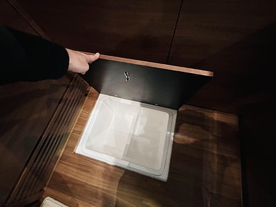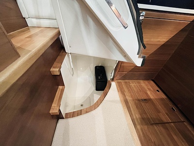 Durk i valnöt i salong, förarplats, pentry, trappsteg ned och mittgång istället för standard matta