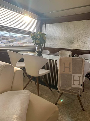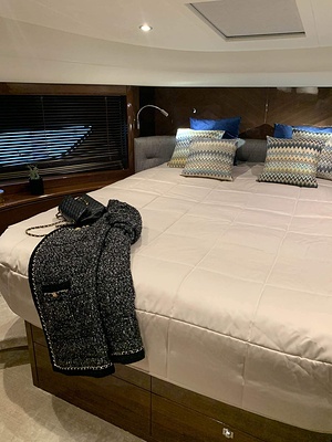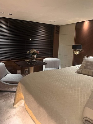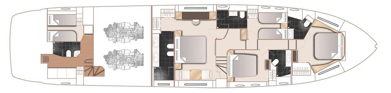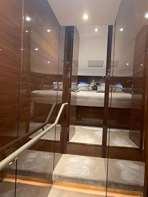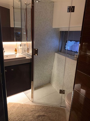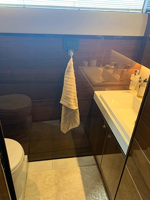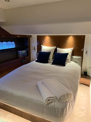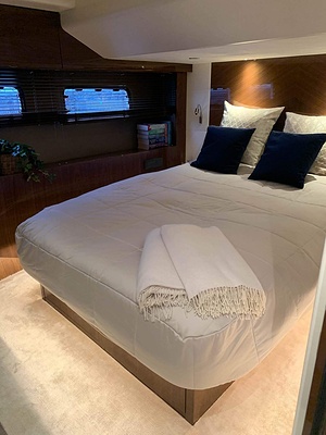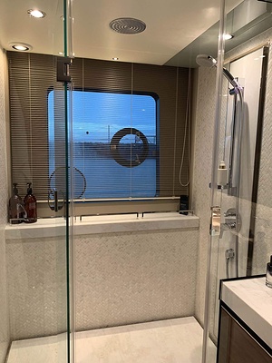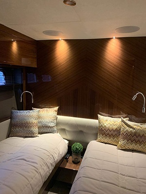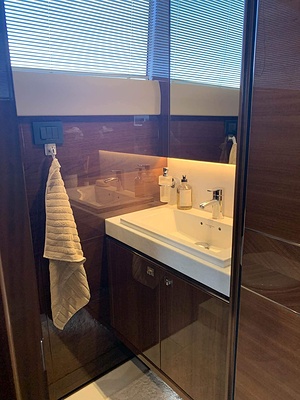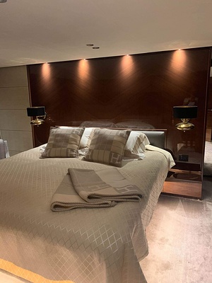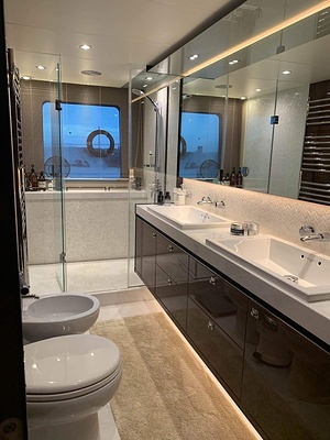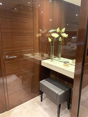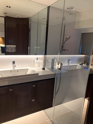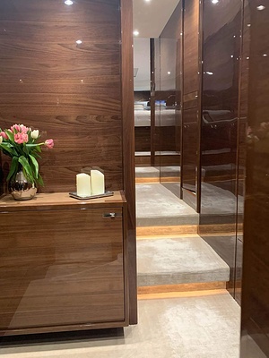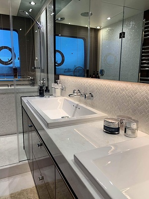 • Port guest cabin with double berth conversion (inboard berth has electric slider to enable conversion to a double), dressing table and ensuite bathroom (in Mystery White marble)