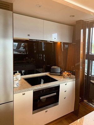 • Starboard guest cabin with double bed and ensuite bathroom (in Mystery White marble)