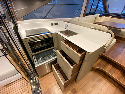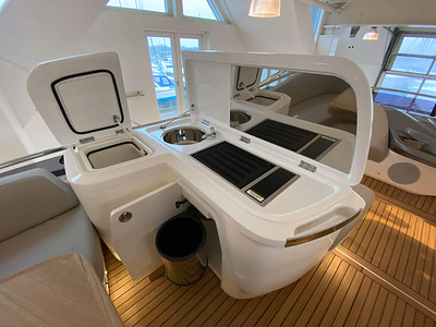 Flybridge wetbar med ho, elektrisk grill, toppmatatad kylbox och skåp med papperskorg