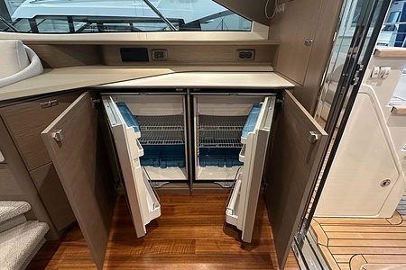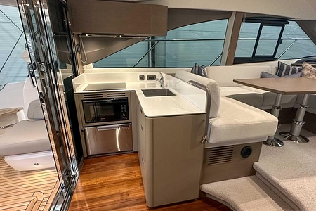 Optional flybridge wetbar incorporating sink, electric griddle/BBQ, waste bin and top loading coolbox