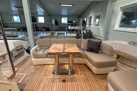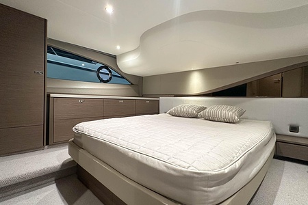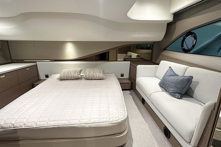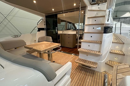 Stunning 2022 model Princess F45 with Silver Oak interior and a massive specification including twin Volvo IPS 650 (480HP) engines / White Hull / Full teak / Generator / Bow thruster / Hi – Lo Platform / Garmin radar / 2+2 Garmin 16″ Displays to lower & upper helm / Garmin VHF / Windscreen demister / Saloon conversion / TV to saloon / TV to aft cabin / Washing machine / Sliding window to portside saloon / Wet Bar with griddle