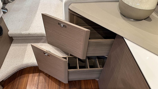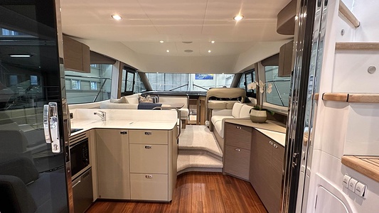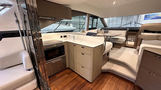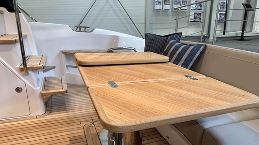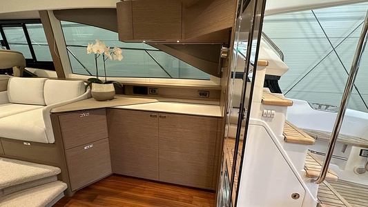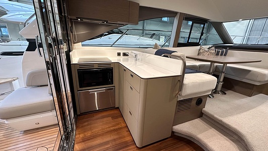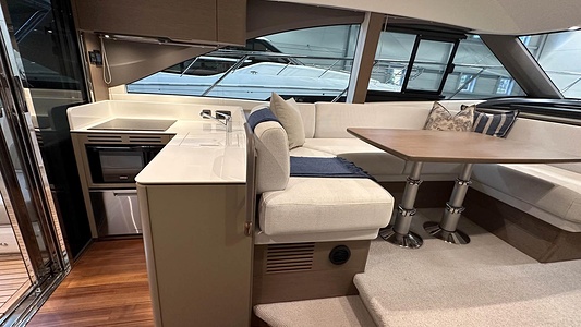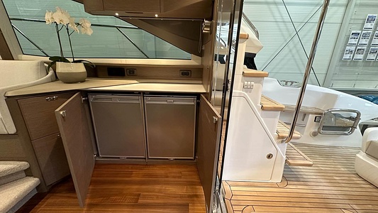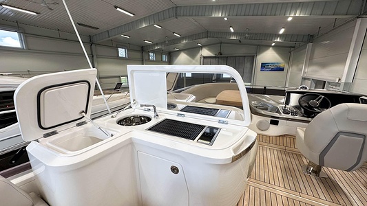 Optional flybridge wetbar incorporating sink, electric griddle/BBQ, waste bin and top loading coolbox