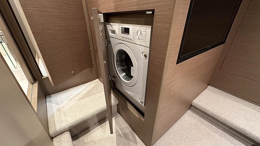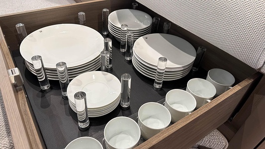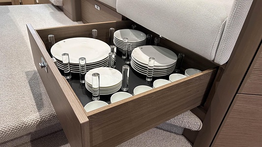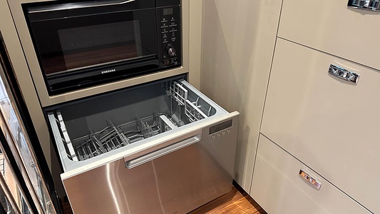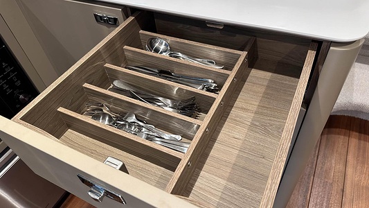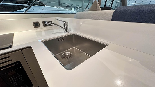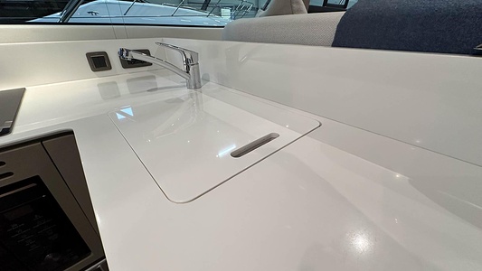 Galley worktops including starboard sideboard are White Solid Surface (satin finish)