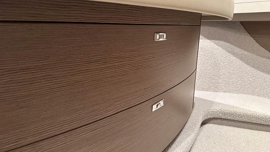 Silver Oak interior wood satin finish (galley floor is in V groove planked Walnut)