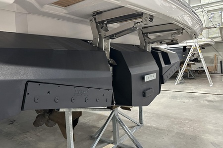 (with dark grey waterline and black antifouling, hull and bathing plaiform fendering is white with stainless steel insert) “