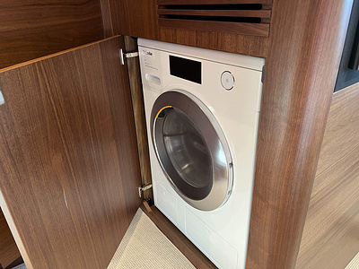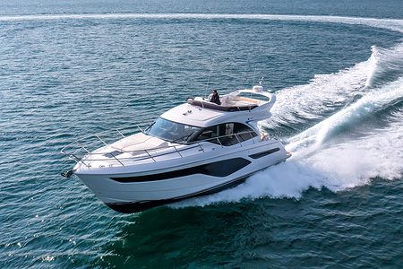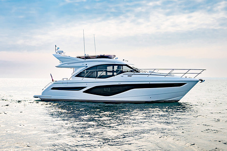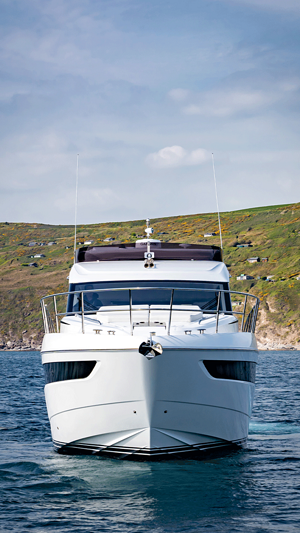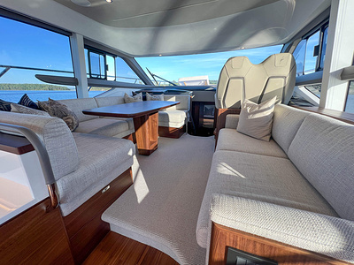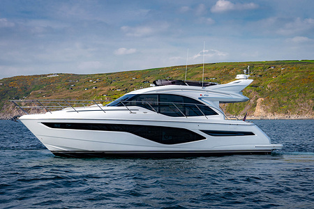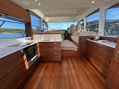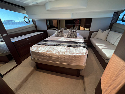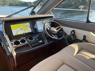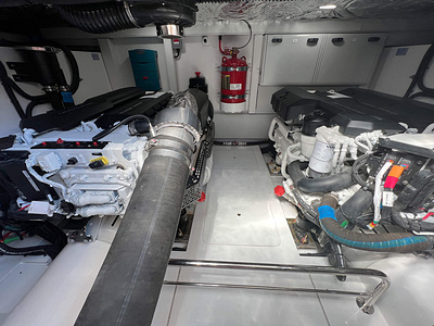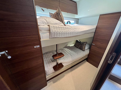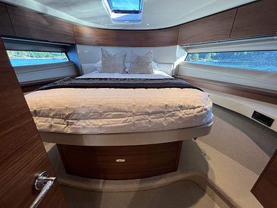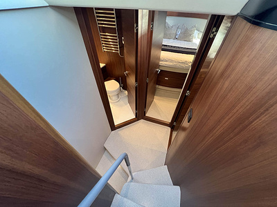 Princess F50 udrustet med 2 x IPS 800 med joystick-styring, Volvo Shadow Drive, sænkbar badeplatform, generator, automatisk trimplans system og Volvo Penta Glass Cockpit navigationssystem. Layoutet har pantry agten i salonen og 3 kabiner. Levering forår 2025.
