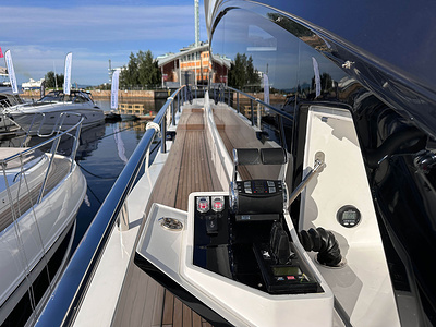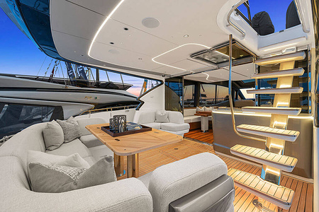 Teak laid cockpit, sportbridge deck, transom platform and steps to sportsbridge are standard on this craft