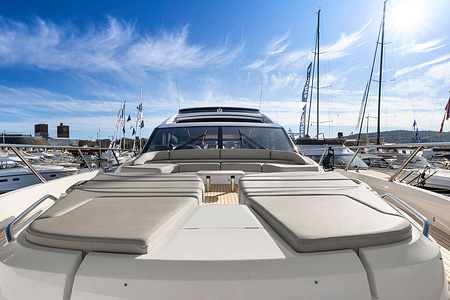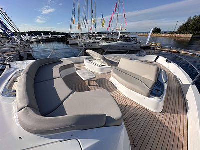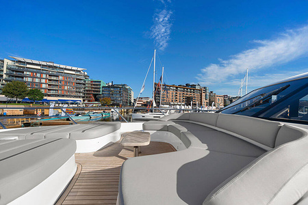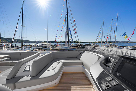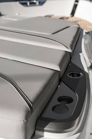 Foredeck, cockpit & sportbridge seating with no contrast. Sunbed cushions with contrast insert in Comfort Exterior III Vogue with Vogue/Met or Hitch contrast