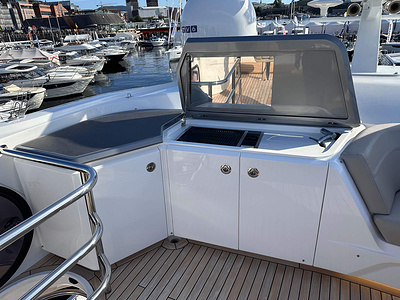 Galley worktops, bar and cockpit servery finish is Sylmar white solid surface as standard.