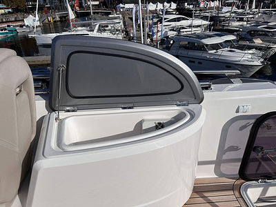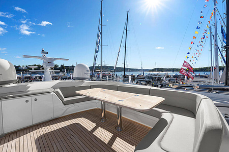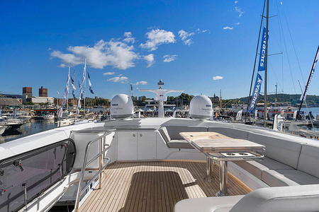 Engine air vent cover in white GRP with graduated vinyl fade to black. Deck house buttresses, cockpit headlining, styling undercut of radar arch and canopy forepeak finished in graphite grey metallic paint. Top side of radar arch in white GRP