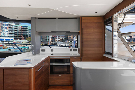 Galley lower units are in boat timber. Top lockers are in Taupe Grey laminate finish