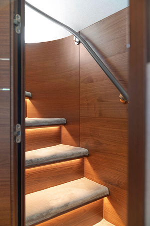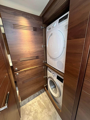 Separate washing machine and condenser dryer machine located below stairs leading to Master Stateroom lobby (in place of standard washer/dryer)