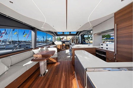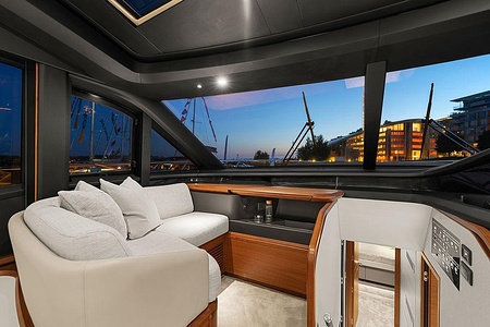 The exterior styling is sleek and purposeful, featuring expansive sun pads fore and aft, a hydraulic bathing platform, and a seamless cockpit layout ideal for entertaining. Large panoramic windows flood the interior with natural light, creating a bright and elegant atmosphere throughout.