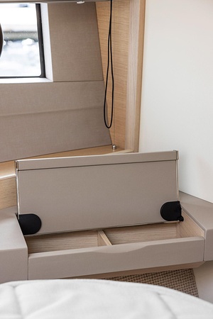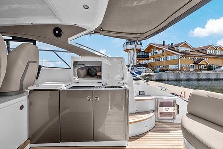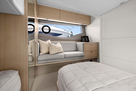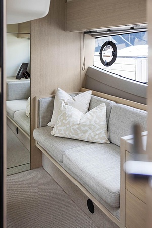 Båten er særdeles velutstyrt med bl.a. senkbar badeplattform, generator, Garmin Glas Cockpit, joystick, varmekabler i baderom og baugspyd. Den romslige akterkabinen har tilvalgt glideskinner som enkelt endrer to enkeltsenger til dobbeltseng.