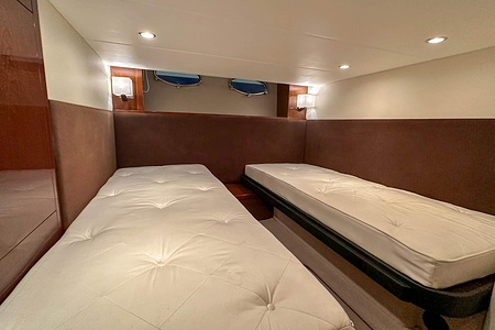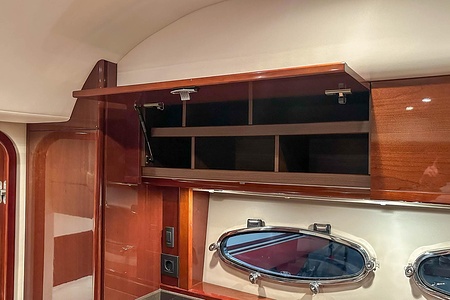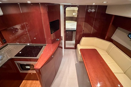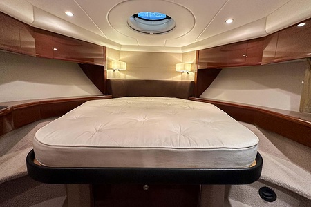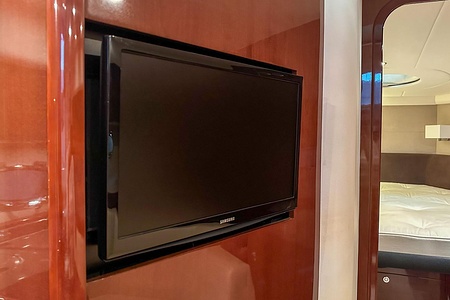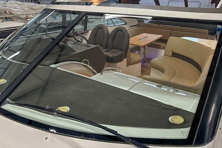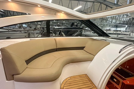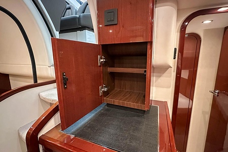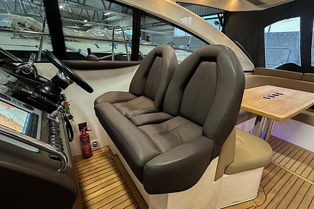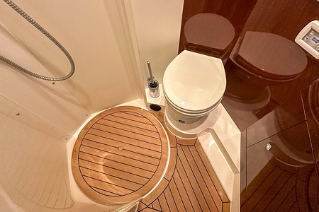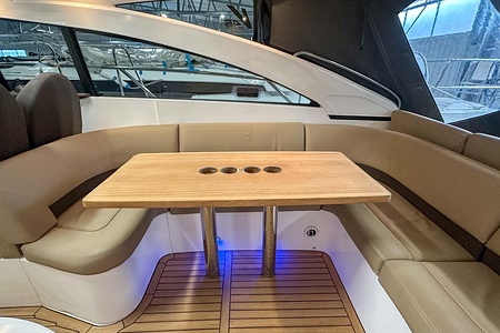 I aktern finns ett rymligt garage för tender, och den väl tilltagna sittbrunnen är utrustad med wetbar innehållande grill, kyl samt både varmt och kallt vatten – perfekt för sociala stunder till sjöss. Båten har genomgått flera fina uppdateringar och är utrustad med helt nylagd teak på badbryggan samt stegen upp mot skarndäcken, vilket ytterligare förstärker det exklusiva helhetsintrycket.