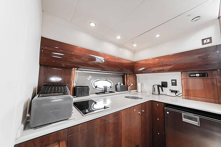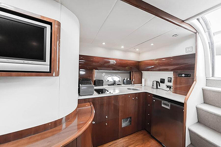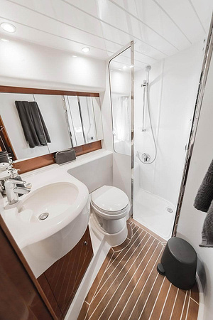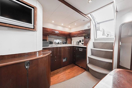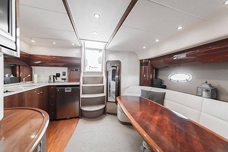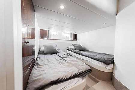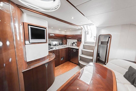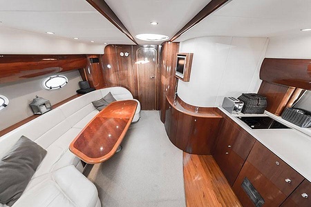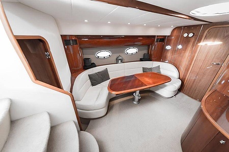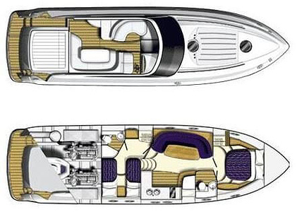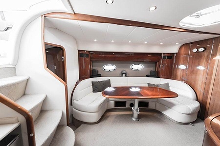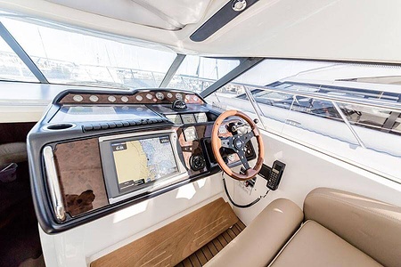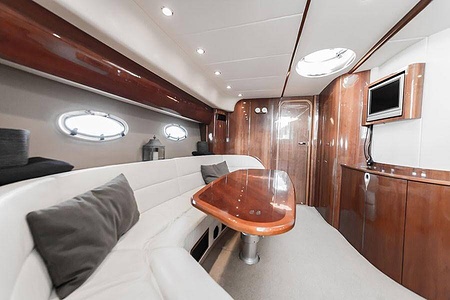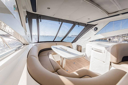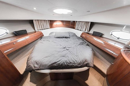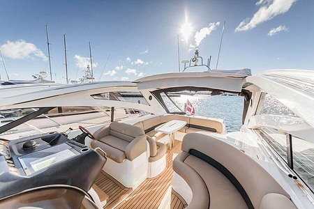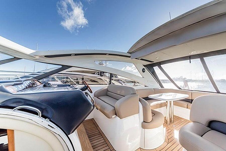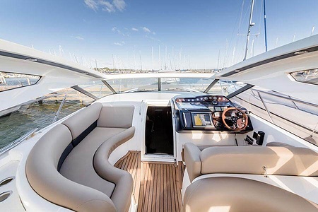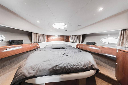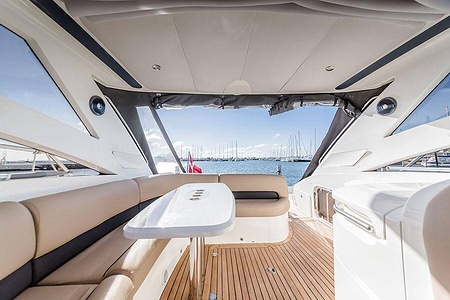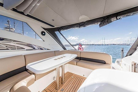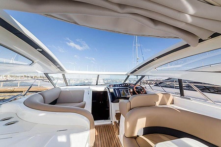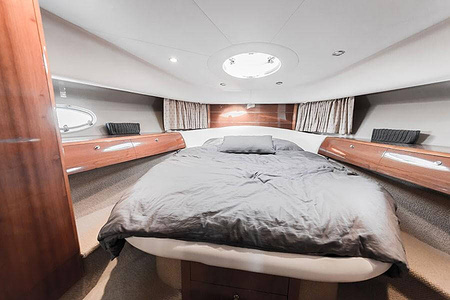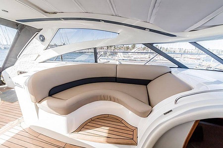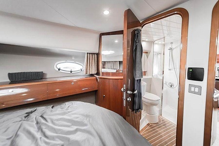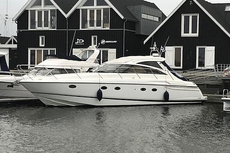 Sportig Princess V46 i fint skick med elektriskt kapelltak, solbädd och garage. Två dubbelkabiner med var sitt badrum.