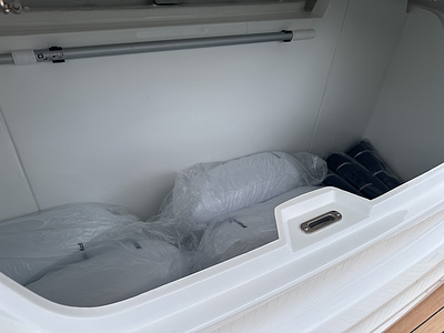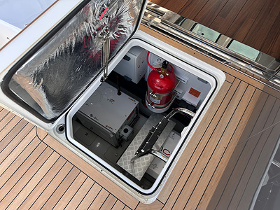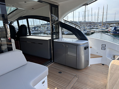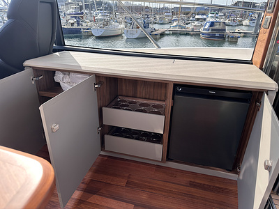 Cockpit wet bar with sink, electric BBQ and storage. Cockpit wet bar facia painted in Platinum metallic