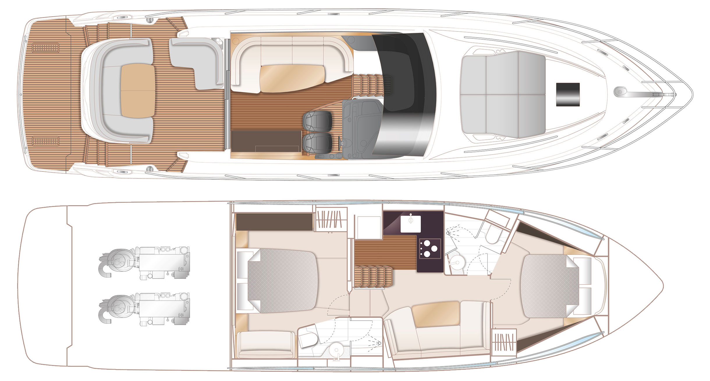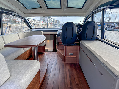 Walnut interior wood satin finish (saloon, galley and helm timber floors are V groove planked walnut as standard)