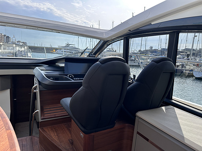 Standard helm console is Anthracite Grey with helm seats in Pitch Black eco upholstery with a Fusion Caviar rear insert panel.