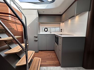 Full height fridge/freezer is fitted as standard. Galley units in lacquered finish