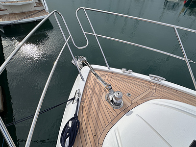 Standard deck material to transom platform, cockpit and steps to side deck is 6mm teak with black caulking