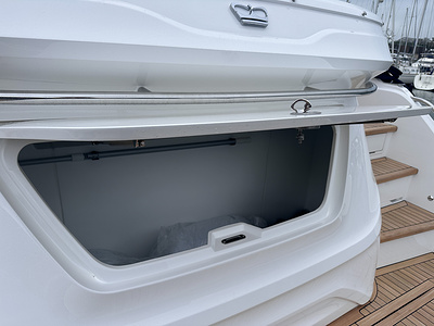 Transom platform to have electro-hydraulic power lift system. The maximum safe working load on the transom platform is 350kg and the maximum recommended permanent load (i.e. tender) is 350kg. Can accommodate up to Williams 285. Includes stainless steel tender slider plates with flush deck plates.