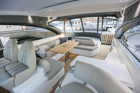 Princess V50 Open (2019) udrustet med dobbelte IPS 600 ~118h med joystick, Volvo Shadow Drive, Humphree automatiske trimplan, Aircondition med varme, generator mm. Layout med to dobbelt kabiner, to WC og salon med mulighed for opredning samt solseng med gummibåds garage agten. Fremvisning i udstillings hallenpå Vindön og klar til levering på Vindön/Sverige.