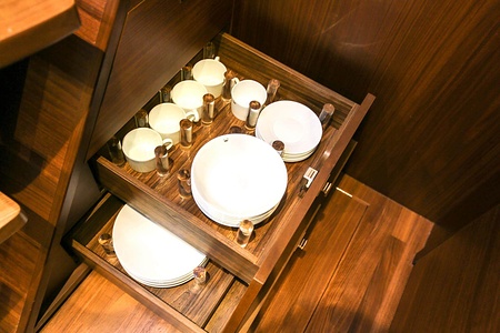 Valnötsinteriör, mattlackerad (durken i salong, pentry och förarplats är i valnöt som standard)