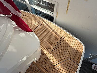 Standard deck material to transom platform, cockpit and steps to side deck is 6mm teak with black caulking