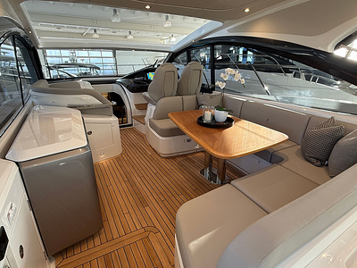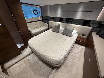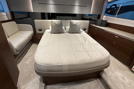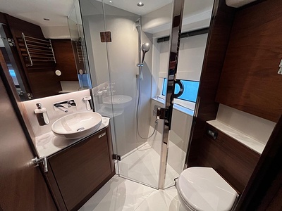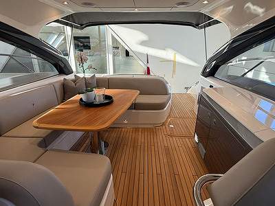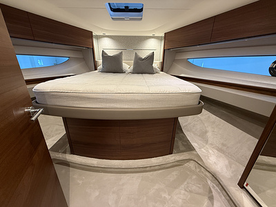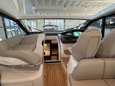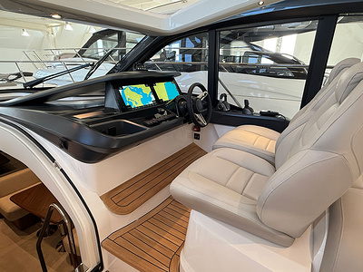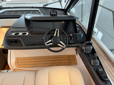 Twin Volvo IPS 650 (2 x 480 hp) are fitted as standard and include joystick control, 16″ Volvo/Garmin display, ACP system and manual Volvo interceptor trimtabs