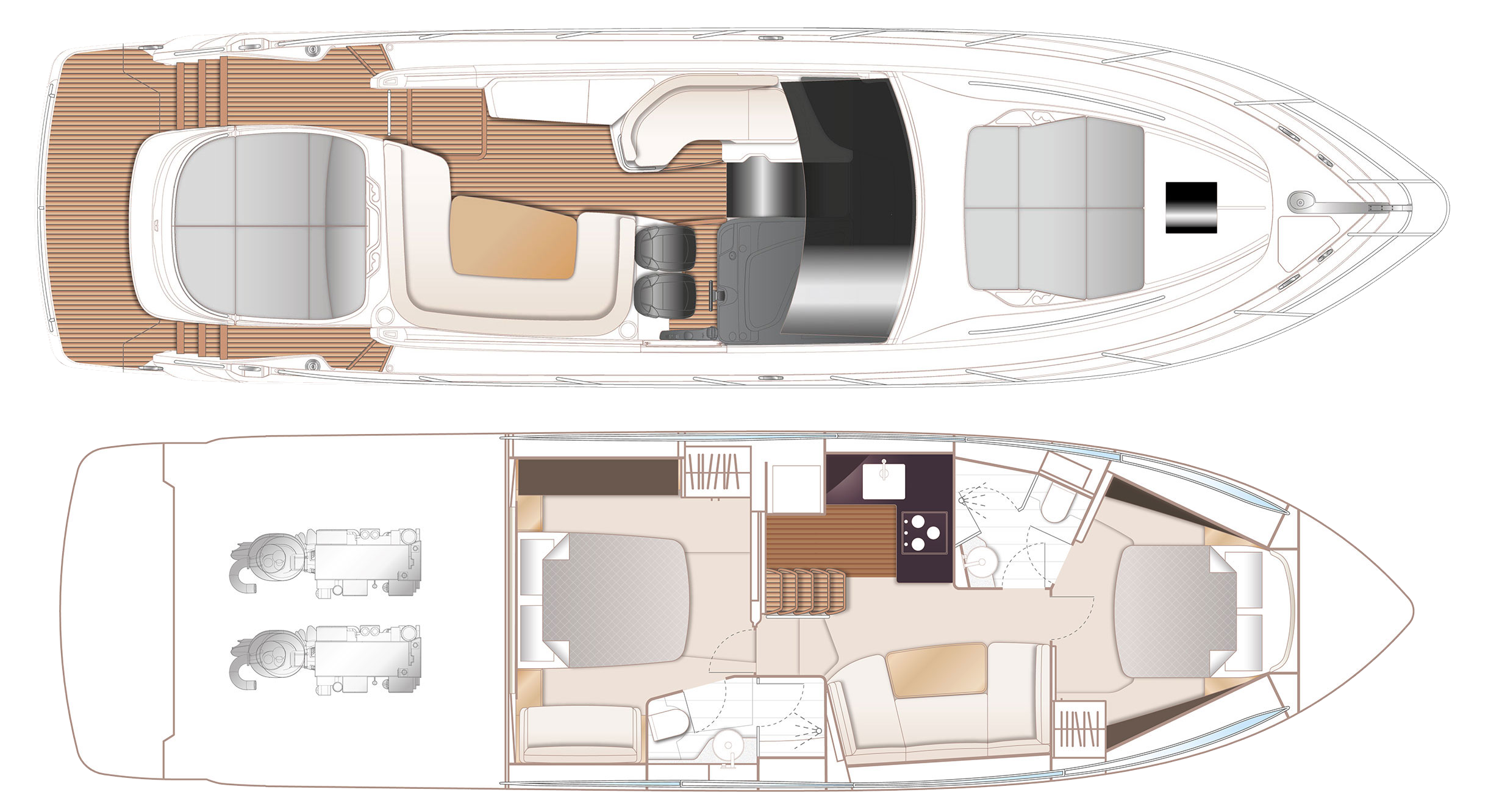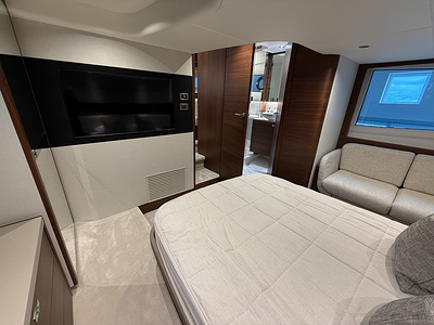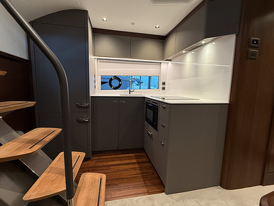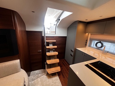 Under dæk findes to rummelige kahytter med egne badeværelser – en masterkahyt midtskibs i fuld bredde og en gæstekahyt forrest. Interiøret er præget af lyse træsorter, eksklusive tekstiler og elegante detaljer, der gør hver eneste minut ombord til en oplevelse.