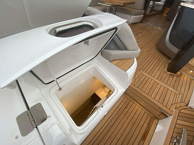 • Lockable gas strut assisted hatches to engine room, lazarette and optional crew cabin