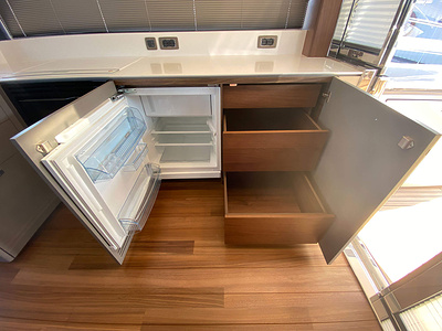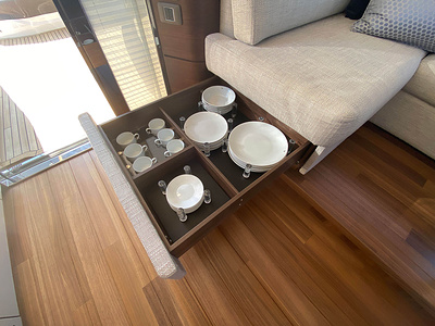 • Stainless steel framed drop down patio door to cockpit with integrated opening window aft of galley