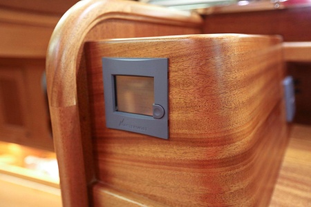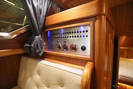 At the navigation station, there is a switch panel with 12V circuit breakers, 2x water tank monitors, 1x fuel monitor and 1x dc monitor