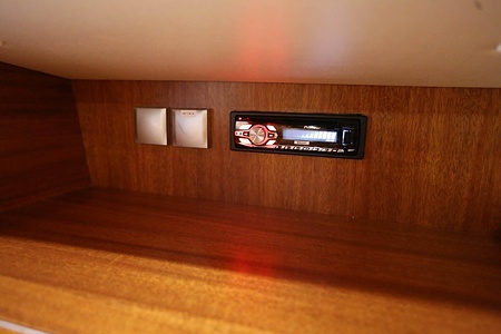 Radio/CD player, 2 speakers in saloon with 1x AUX for external inputs (3,5 mm plug)
