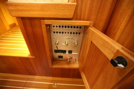 The 230V shore power system includes 20m cable, Mastervolt Mass GI Galvanic Isolator, Mastervolt Masterswitch panel including RCD breaker (earth fault indicator), separate 10 A fuses for starboard and portside of the 230V system and 4 sockets (230V) in total